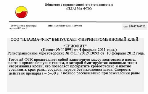 КЛИНИЧЕСКИЕ ИСПЫТАНИЯ КЛЕЯ "КРИОФИТ"